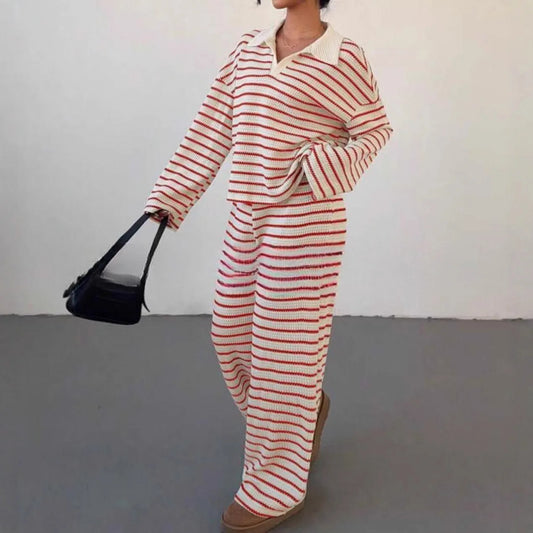 Women’s Knitted Striped Shirt & Pants Set – Casual Loose Fit