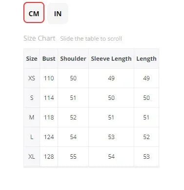 size_info: {"sizeInfoList":[{"length":{"cm":"110","inch":"43.31"},"size":"XS","vid":-1},{"length":{"cm":"114","inch":"44.88"},"size":"S","vid":-2},{"length":{"cm":"118","inch":"46.46"},"size":"M","vid":-3},{"length":{"cm":"122","inch":"48.03"},"size":"L","vid":-4},{"length":{"cm":"126","inch":"49.61"},"size":"XL","vid":-5}]}