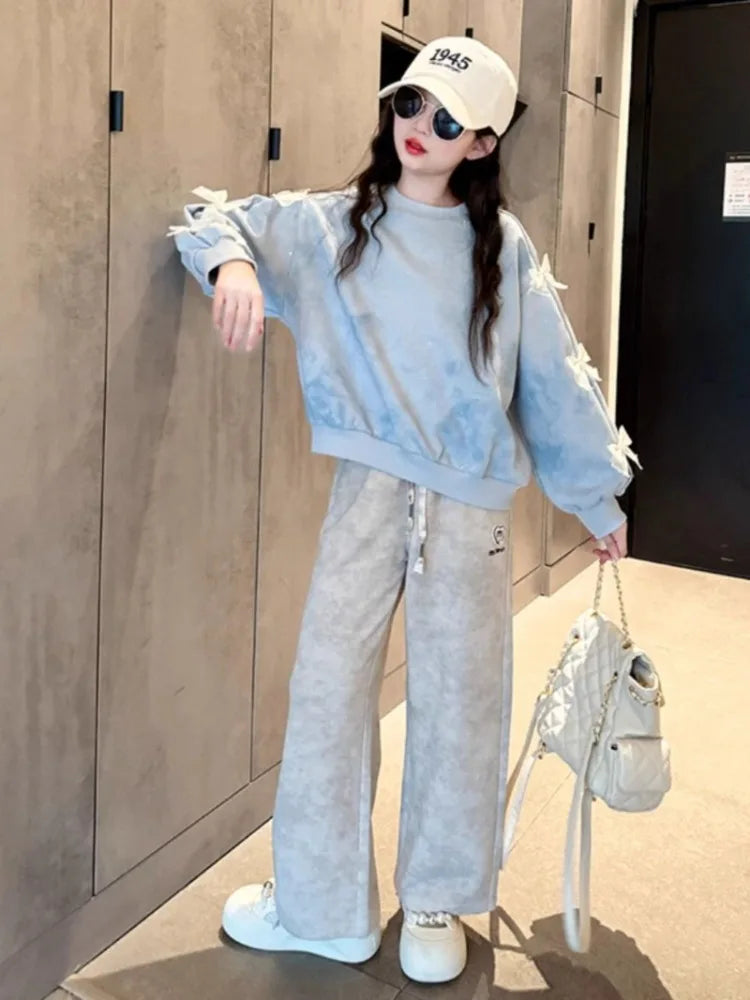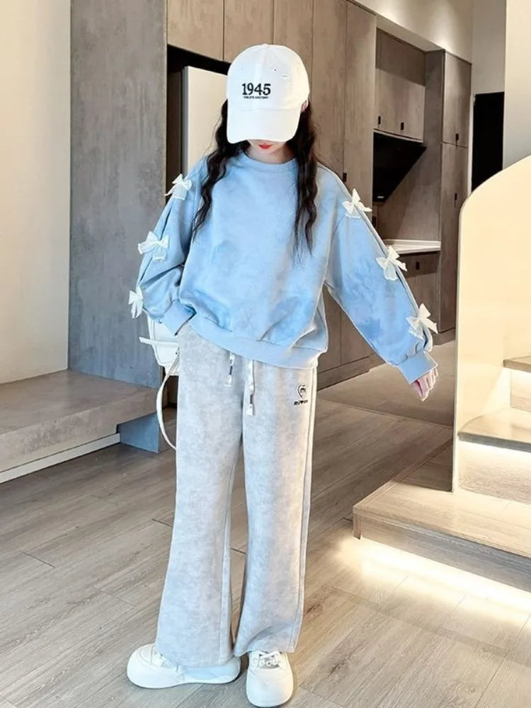 Girls’ Autumn/Winter 2-Piece Outfit – Bow Sweatshirt with Pants